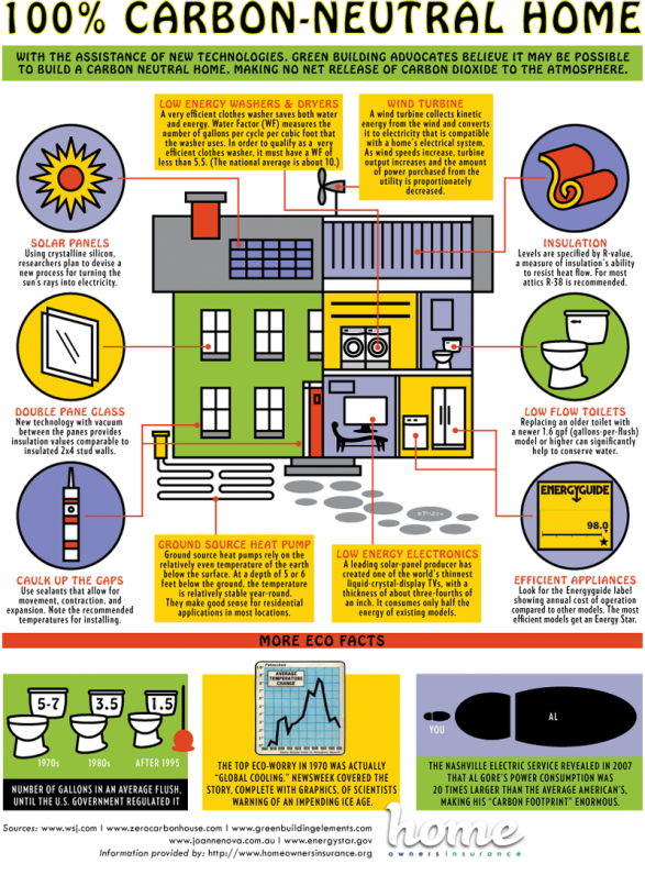By building green features such as low flow toilets, solar panels, and double pane doors and windows into a new home we are getting closer and closer to a carbon neutral home.